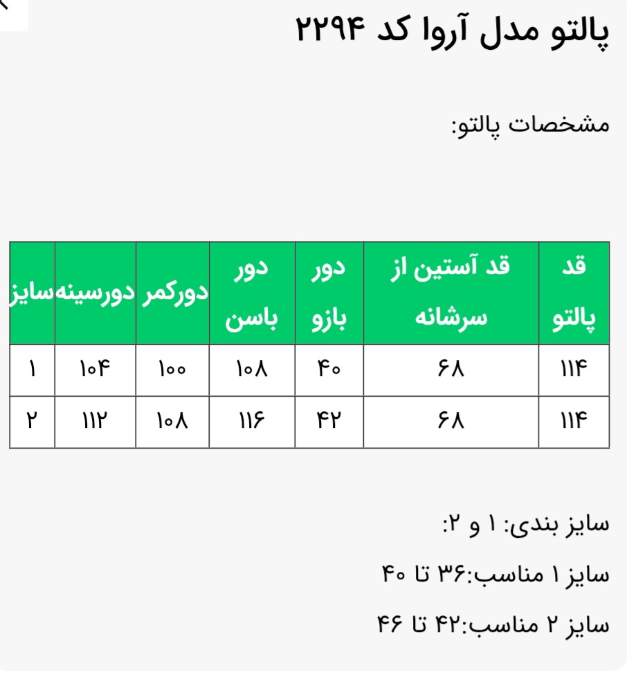 پالتو مدل آروا سایزبندی ۳۶ تا ۴۶